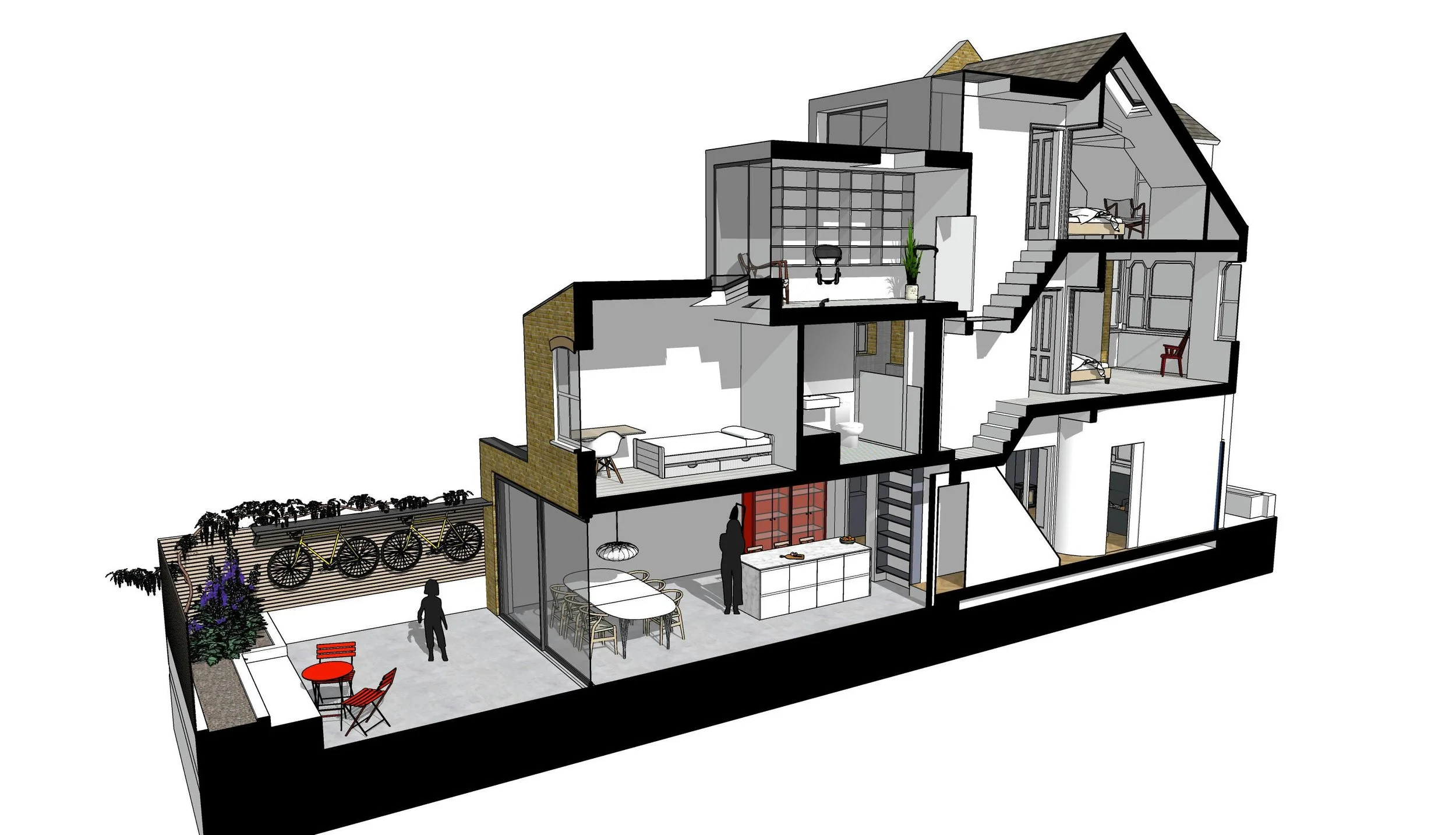 Next to Waterlow park in North london this house was a complete wreak that was fully transformed and modernised for a young family. The ground floor spaces were opened up to create free flowing and light filled spaces with long views. Bowing upper walls where suspended on beams and stabilised.